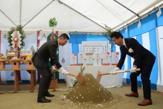鍬入れをする十文字社長と竹本副社長