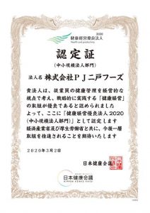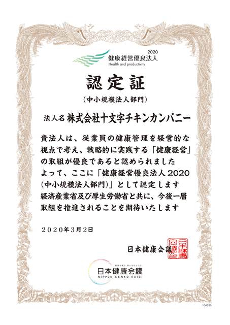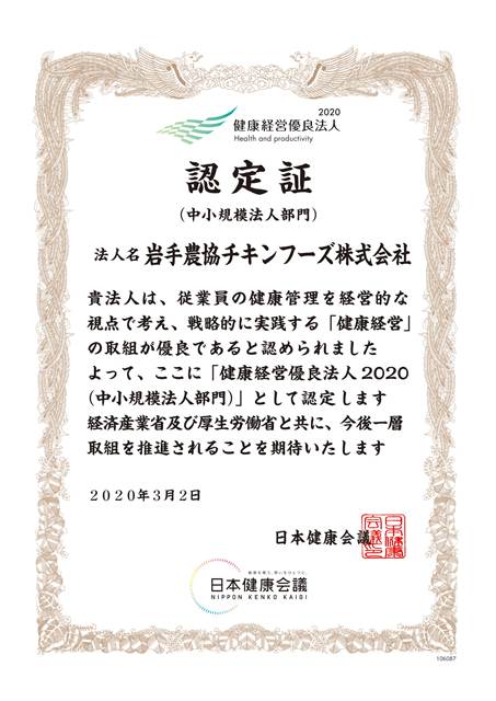 ㈱十文字チキンカンパニー、岩手農協チキンフーズ㈱、㈱PJ二戸フーズは、2020年3月2日付で健康経営優良法人2020(中小規模法人部門)認定を受けました。
