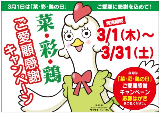 今年は「菜彩鶏ご愛顧感謝キャンペーン」を開催致します。詳細は以下の通りになります。