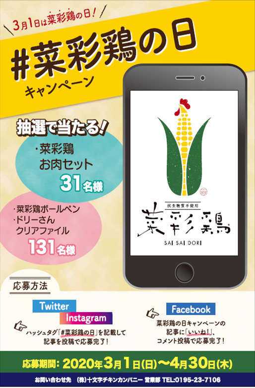 Twitter、instagram:ハッシュタグ「#菜彩鶏の日」を記載して記事を投稿で応募完了!