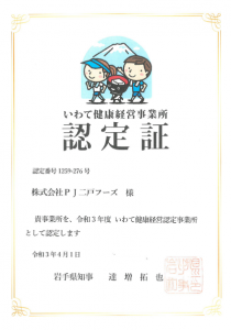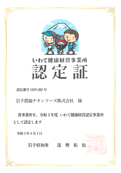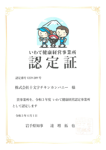 前年度に引き続き、株式会社十文字チキンカンパニー、岩手農協チキンフーズ株式会社、株式会社PJ二戸フーズの3法人で、2021年4月1日付で「いわて健康経営事業所」認定を受けました。