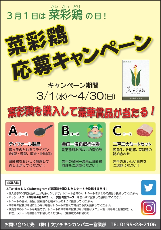2.対象写真と文章にハッシュタグ「#菜彩鶏2023」、希望賞品コースを記載の上、InstagramもしくはTwitterにて投稿で応募完了。