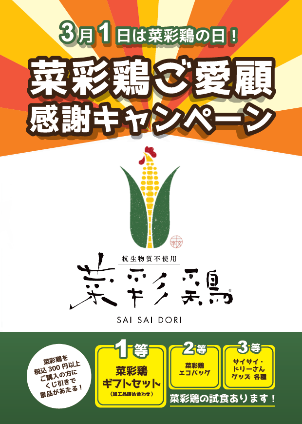 今年も「菜彩鶏ご愛顧感謝キャンペーン」を開催致します。詳細は以下の通りになります。